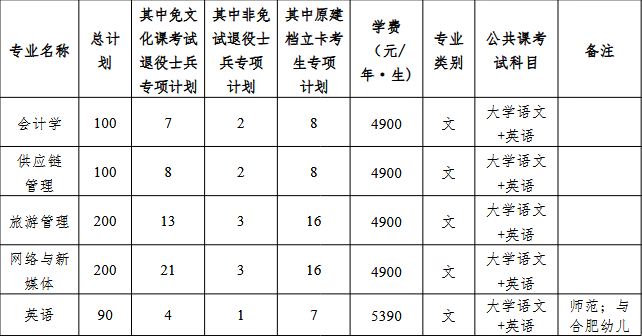 注:(1)免文化课考试退役士兵专项计划文理兼招。