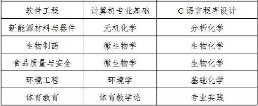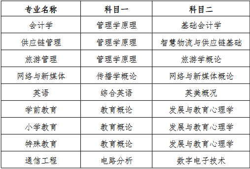 考试科目由“2 门公共课(各 150 分)+2 门专业课(各150分)”组成,其中公共课由省教育招生考试院组织统考。专业课由我校组织考试,考试科目如下 :