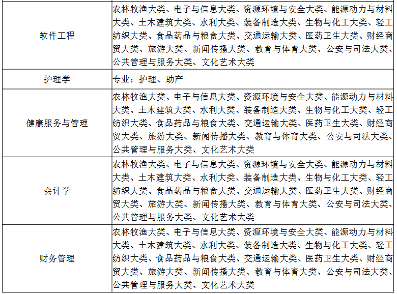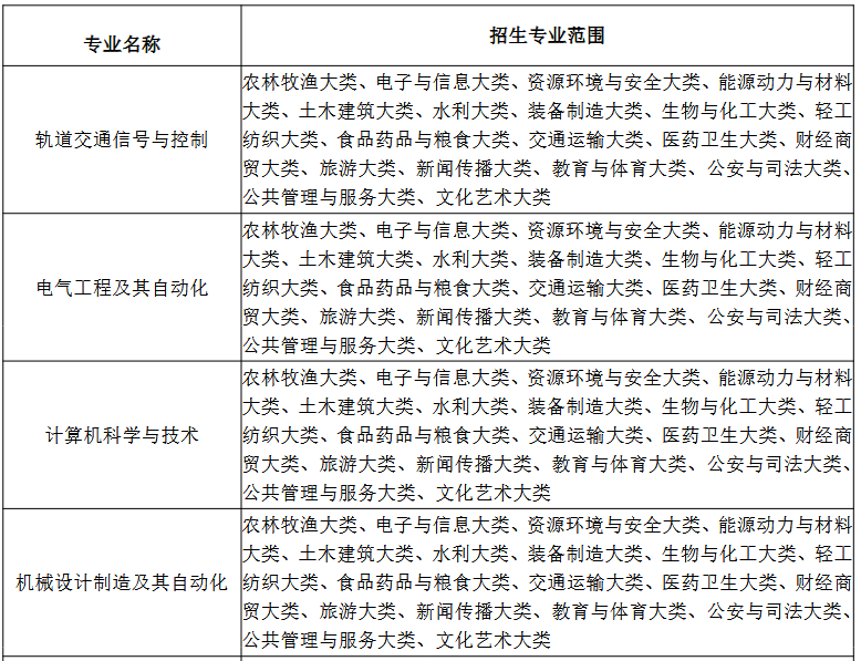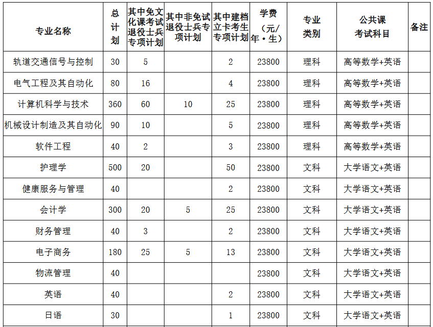 (2)申请调剂非免试退役士兵专项、建档立卡专项及其他非专项类缺额计划的考生须符合以下全部条件:a.申请调剂的专业与原报考专业公共课考试科目相同、专业类别一致,不接受跨专业类别调剂;b.公共课达到省考试院统一划定的分数线且未被任何学校录取;c.毕业专业须符合我校招生专业范围要求;d.调剂报考我校轨道交通信号与控制、电气工程及其自动化、计算机科学与技术、机械设计制造及其自动化、软件工程专业:考生原报考专业须为理科专业(公共课考试科目为高等数学+英语);调剂报考我校健康服务与管理、会计学、财务管理、电子商务、物流管理、英语、日语、汉语言文学专业:考生原报考专业须为文科专业(公共课考试科目为大学语文+英语);调剂报考我校护理学专业:原报考专业须为护理学类;调剂报考我校视觉传达设计、数字媒体艺术专业:原报考专业须为美术学类、设计学类、戏剧与影视学类。