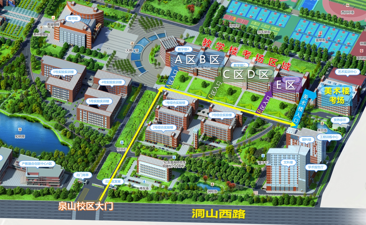 考生进入考场前务必看清准考证上对应考场入口,本次考试共设有4个考场入口,考场在教学楼A\B区的考生由A区入口进入,考场在教学楼C\D区的考生由C区入口进入,考场在教学楼E区的考生由E区入口进入,美术类专业考生由美术楼入口进入。