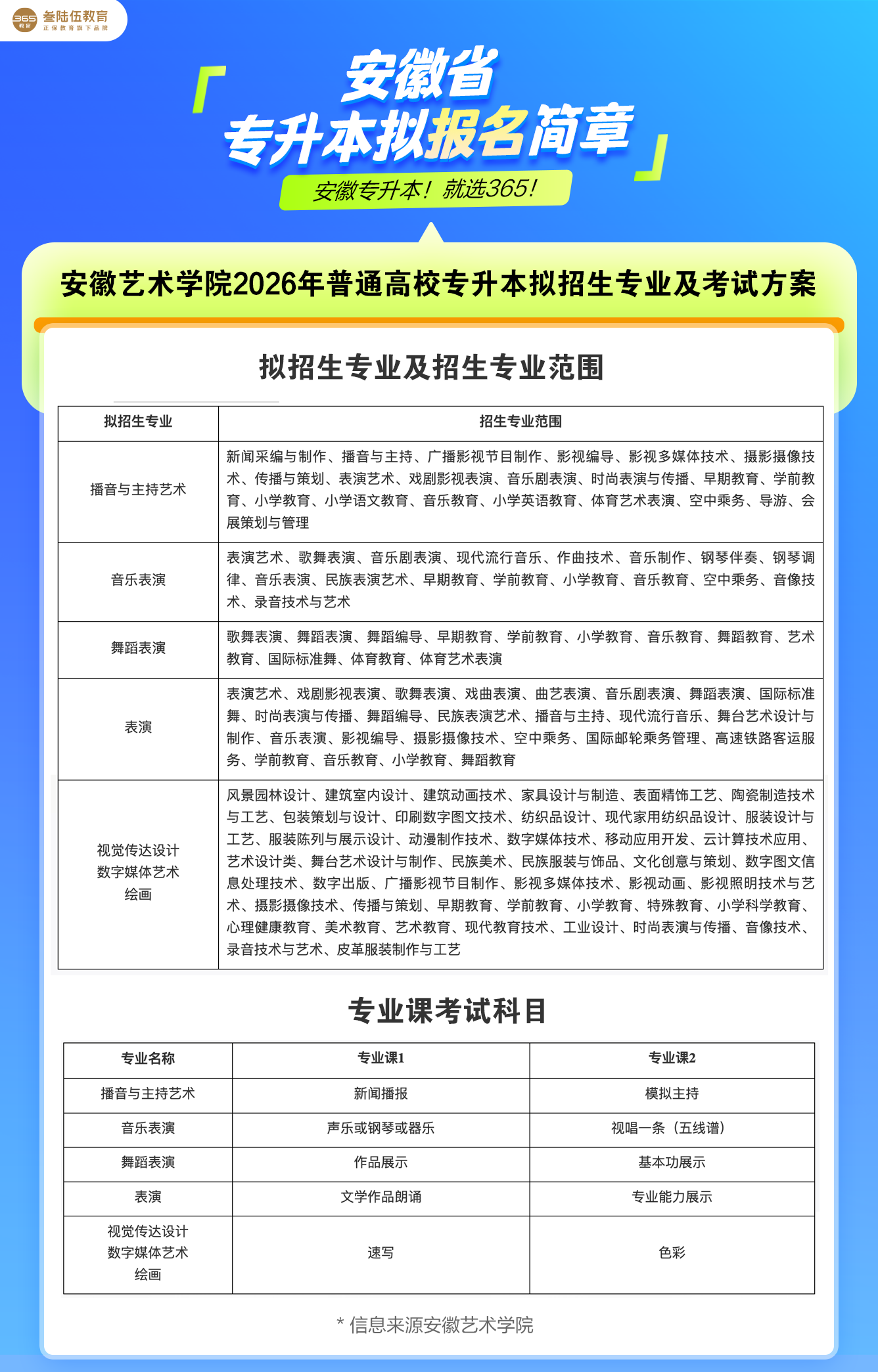 安徽艺术学院2026年普通高校专升本招生方案(拟)