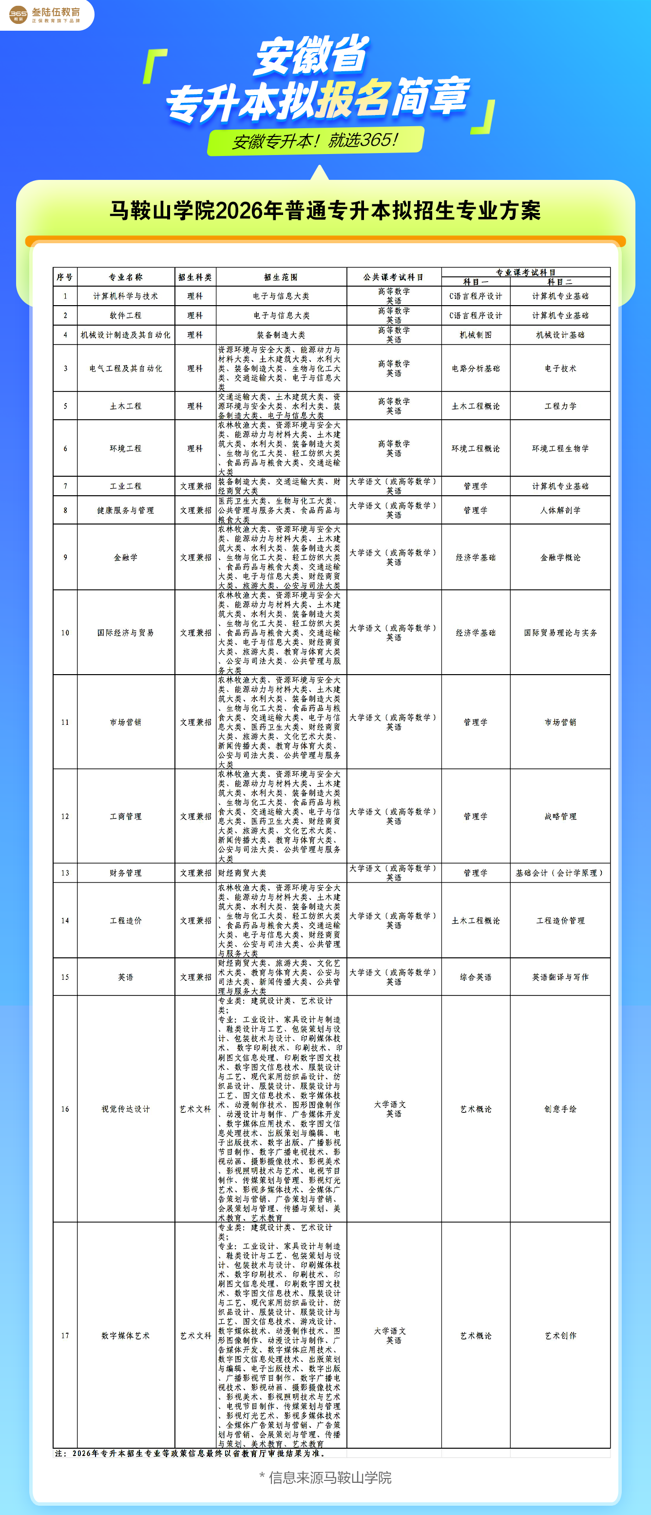 马鞍山学院2026年普通高校专升本招生方案(拟)