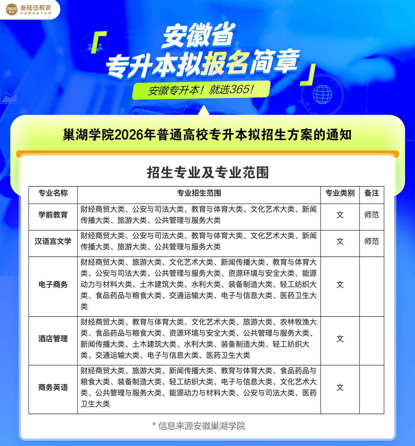 巢湖学院2026年普通高校专升本招生方案(拟)