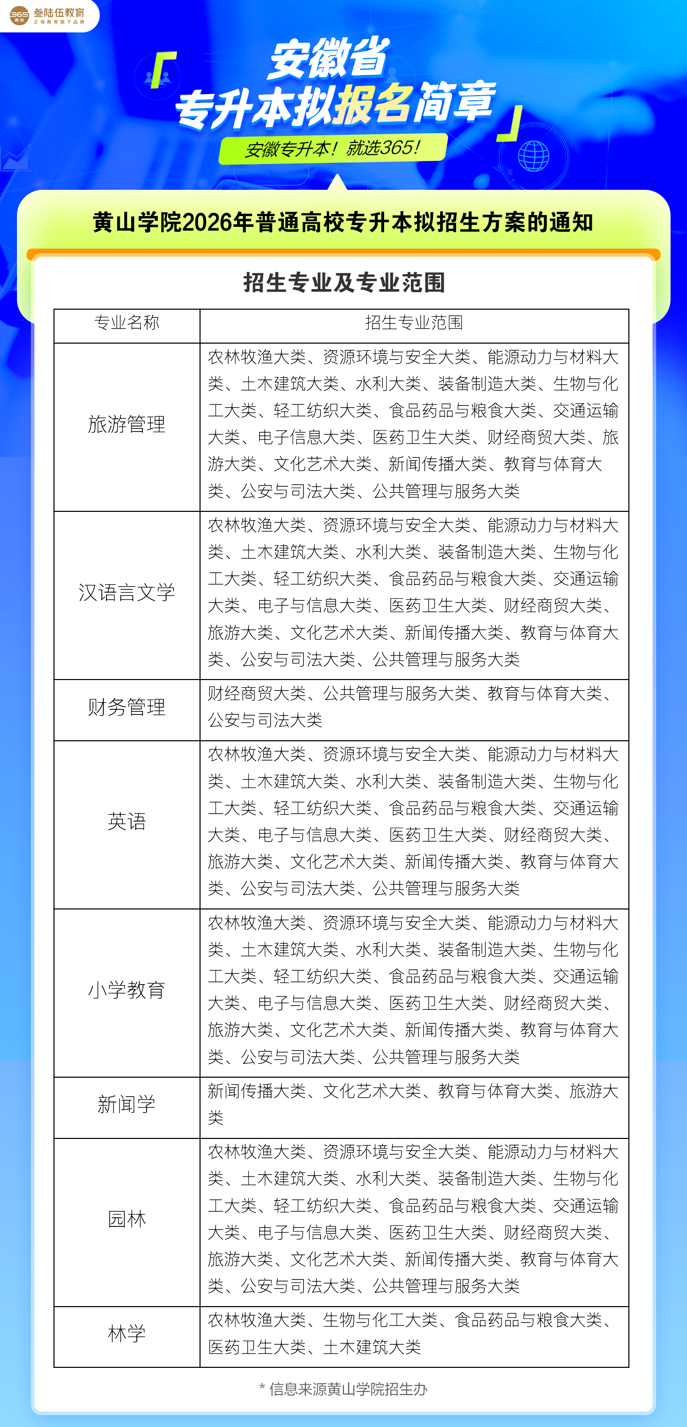 黄山学院2026年普通专升本拟招生专业方案(拟)